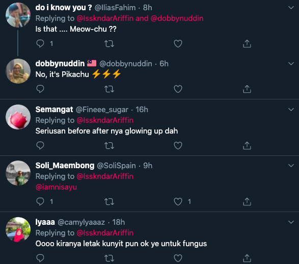Menerusi Twitter Iskandar Ariffin yang mengambil foto comel tersebut menerusi Facebook dakucingku, kucing tersebut dipercayai dilumur dengan kunyit disebabkan masalah fungus.